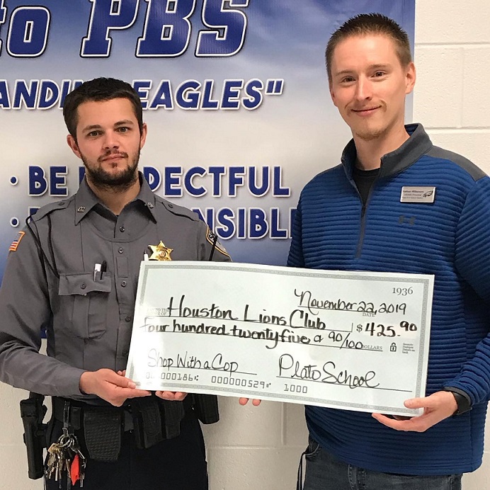 Plato High School and Middle School principal Nathan Wilkerson presented Officer McConnell with a $425.90 check for the Houston Lions Club to help the cause.