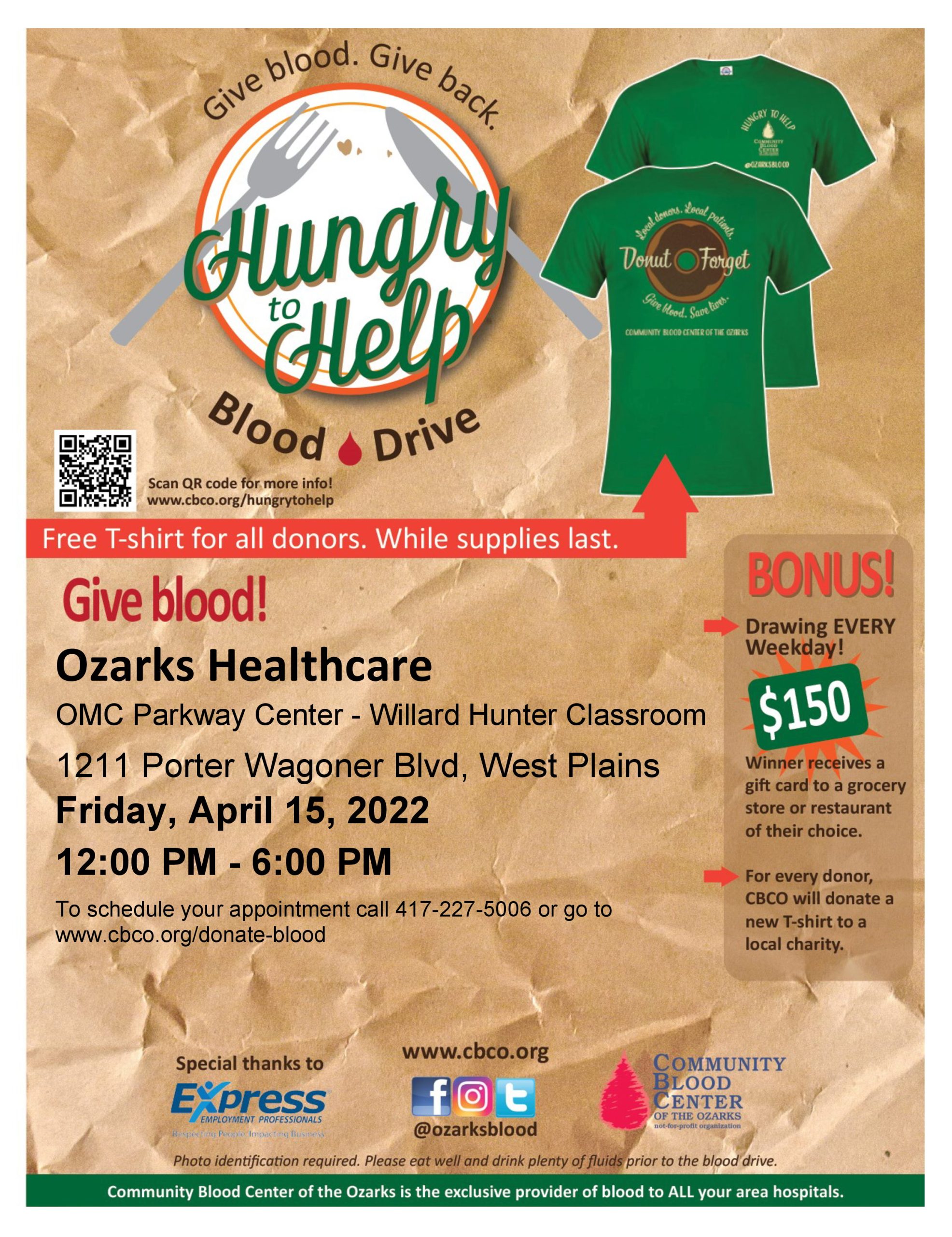 Appointments are strongly encouraged to be made ahead of the drive. To schedule your appointment, call 417-227-5006 or go to www.cbco.org/donate-blood. Donors will receive a free t-shirt while supplies last and be entered to win a drawing for a gift card to a grocery store or restaurant of their choice. For every donor, the CBCO will donate a new t-shirt to a local charity.