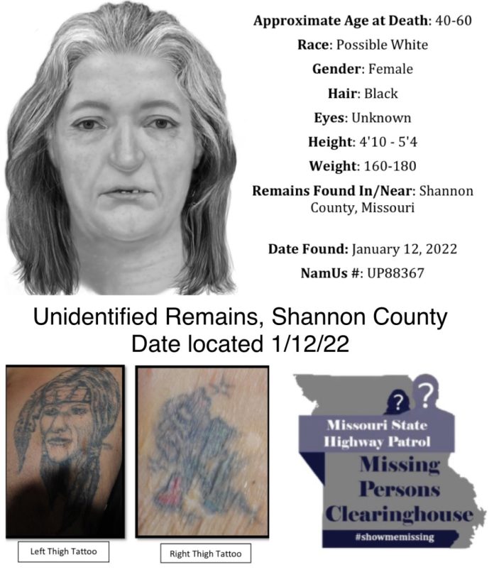 Willow Springs, MO. – The Missouri State Highway Patrol is seeking the public’s assistance in identifying a Jane Doe whose remains were found along U.S. Highway 60 near Winona, MO, in Shannon County on January 12, 2022. The Jane Doe is believed to have been 40-60 years old, 4’10” to 5’4″ tall, and weighed between 160-180 pounds. She had black, salt and pepper hair at the time of her death.
