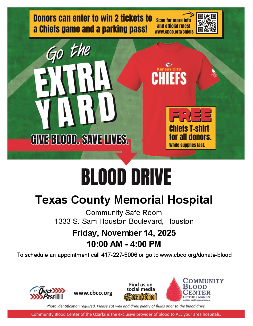Houston, MO. – Football fans, here’s your chance to score big this season. Community Blood Center of the Ozarks, the sole supplier of blood, platelets, and plasma to patients at over 40 hospitals, invites you to go the extra yard for local patients. Make a lifesaving play at the upcoming blood drive at Texas County Memorial Hospital on Friday, November 14.