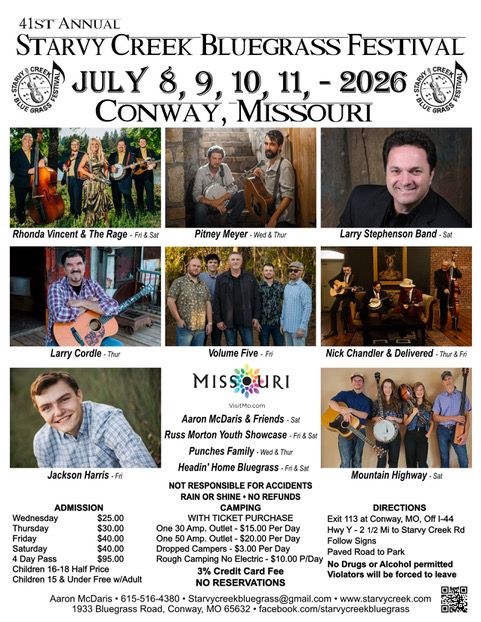 Headline performances during the event include Rhonda Vincent &The Rage, Pitney Meyer, and the Larry Stephenson Band.