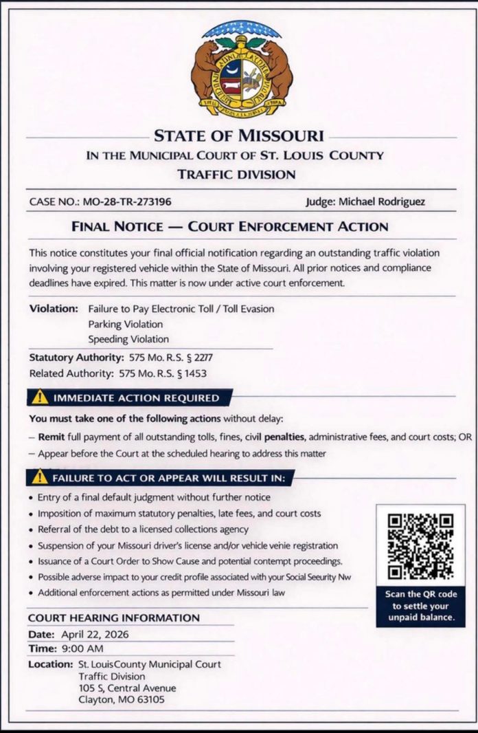 We have been made aware of fraudulent “Final Notice – Court Enforcement Action” text messages being circulated claiming to be from a Missouri court regarding unpaid traffic violations.
