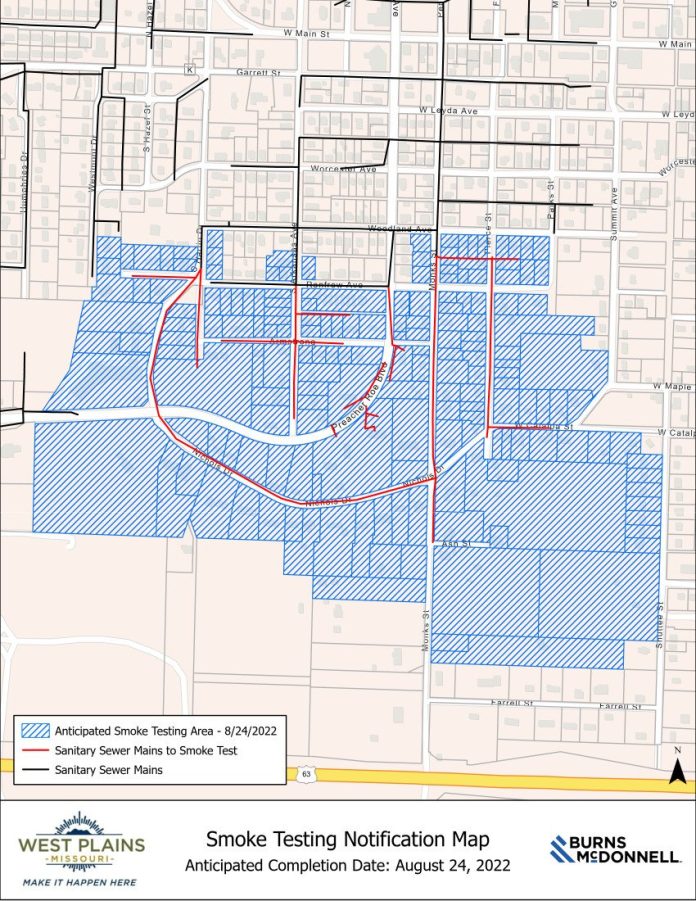 The City of West Plains and personnel from Burns & McDonnell will be conducting smoke testing on the sanitary sewer lines throughout the city during the period of: August 15, 2022 – September 30, 2022.