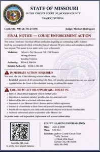 The notices are designed to look official, often displaying the Missouri state seal and claiming to come from a court. Many include a QR code that directs recipients to make an immediate payment.