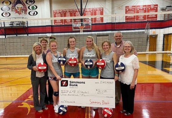 The Liberty High School volleyball team recently received a $300 donation from Simmons Bank for the purchase of new volleyballs. Pictured, left to right: Simmons Bank Associates Melody Cooper and Theresa Gehlken, Liberty volleyball seniors Jocelyn Clark, Kelstin Roy, Peyton Bush and Aspen Smotherman, and Simmons Bank Associates Eric Wells and Ann Miller.