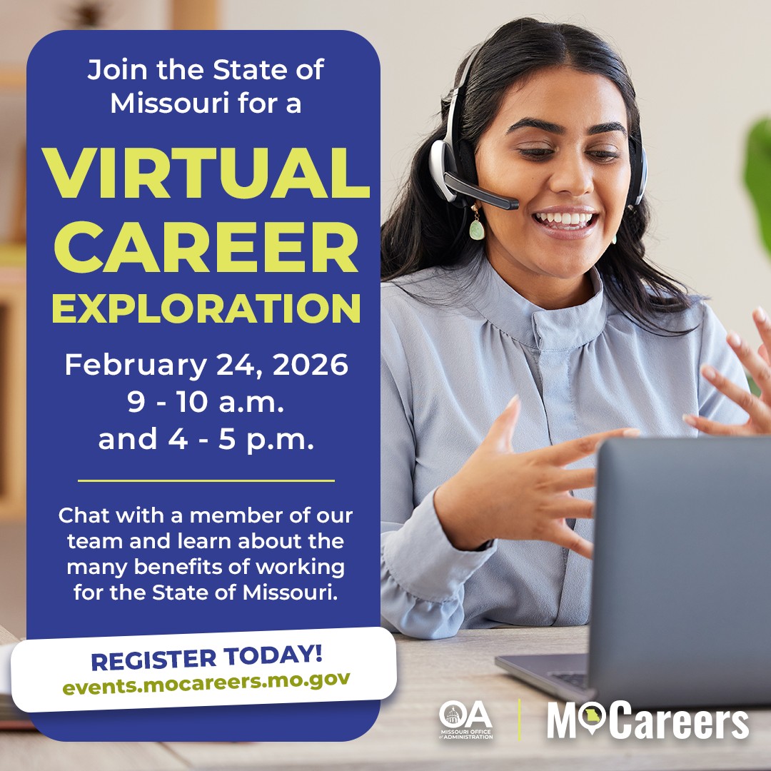 Attend the State of Missouri Virtual Career Exploration event on February 24 from 9 to 10 a.m. or 4 to 5 p.m. to connect with recruiters and find a job fit for you. Register now to transform your career!