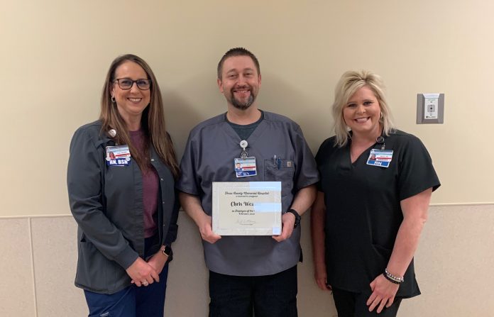 Local News TCMH employee of the month By - March 23, 2020 FacebookTwitterPinterestWhatsApp Texas County Memorial Hospital’s February Employee of the Month, Chris Weaver with his former supervisor Holli Massey, left and Mandy Pender, TCMH emergency department director, right. ShareTweet Advertisement