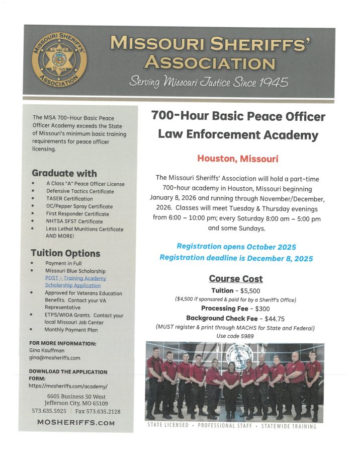 Houston, MO. – A part-time, 700-hour Law Enforcement Academy will be held in Houston, Missouri, and organizers are asking those interested to submit their applications before December 8th.