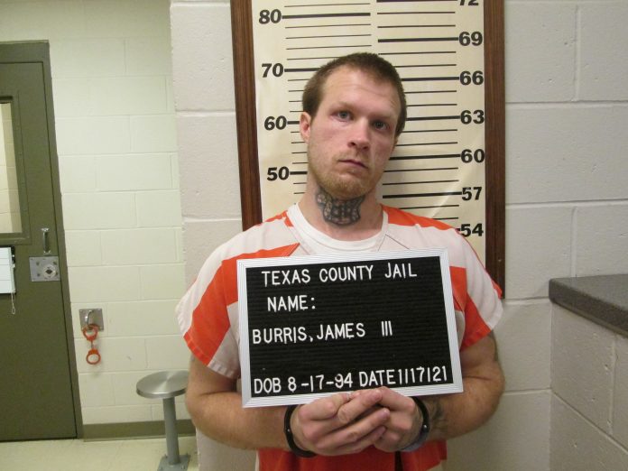 James Burris III, 26, of Licking was arrested on a felony Texas County warrant charging him with Stealing. Burris was held in the Texas County Jail on a $100,000 bond. A probable cause statement seeking additional charges for the prohibited items in the jail will be submitted to the Texas County Prosecuting Attorney.