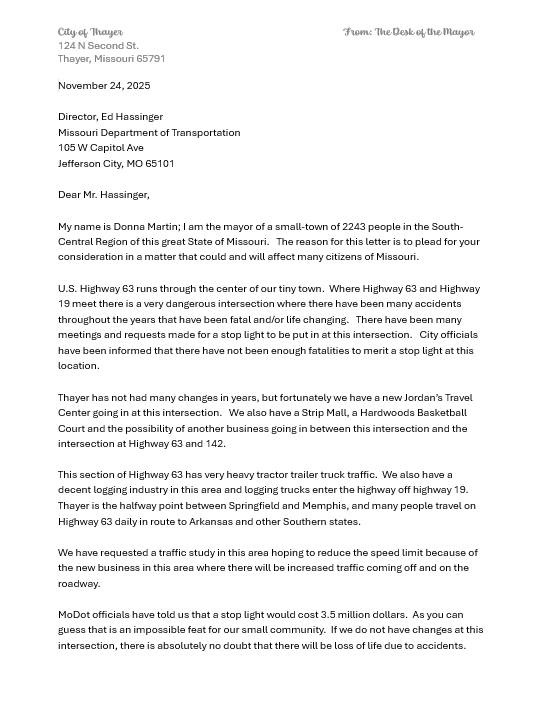 Please read the attached letter, and feel free to send an email to MoDot leadership with the subject line, A Plea for Help. Hopefully an inbox with the same subject line will get some attention. We will also be posting a petition for anyone who drives this stretch of road to sign. We want MoDot to know how important safe roads are to our community and all who drive through our City and State. Thank you for your consideration and participation.