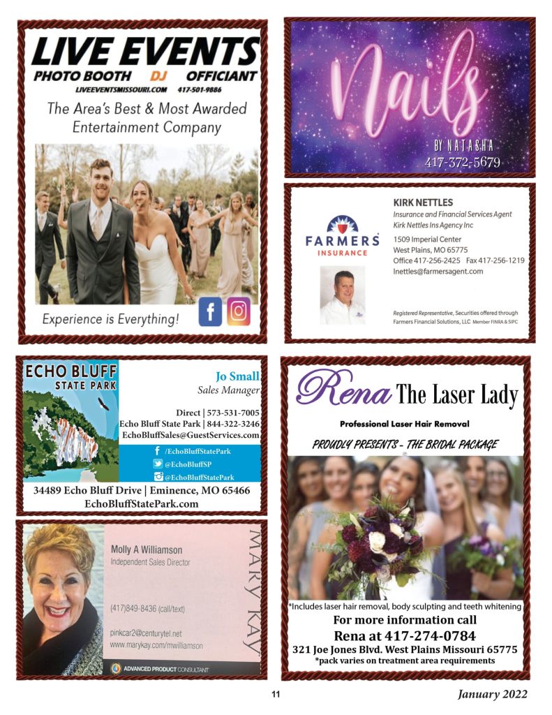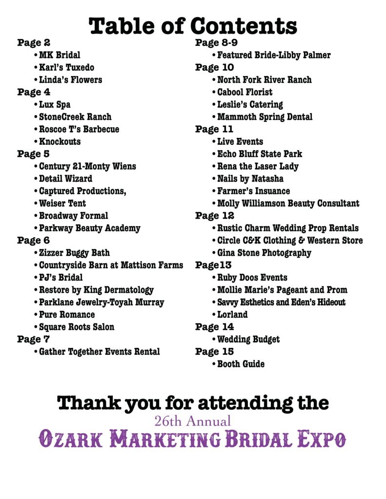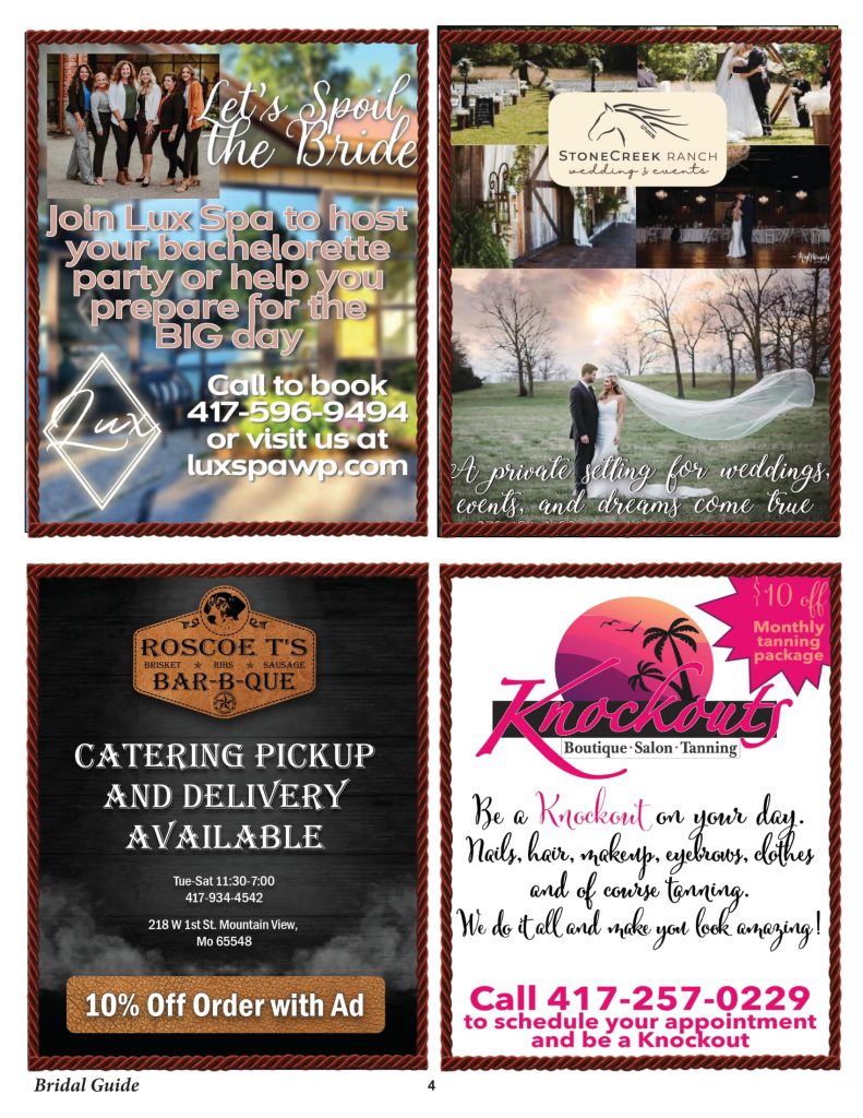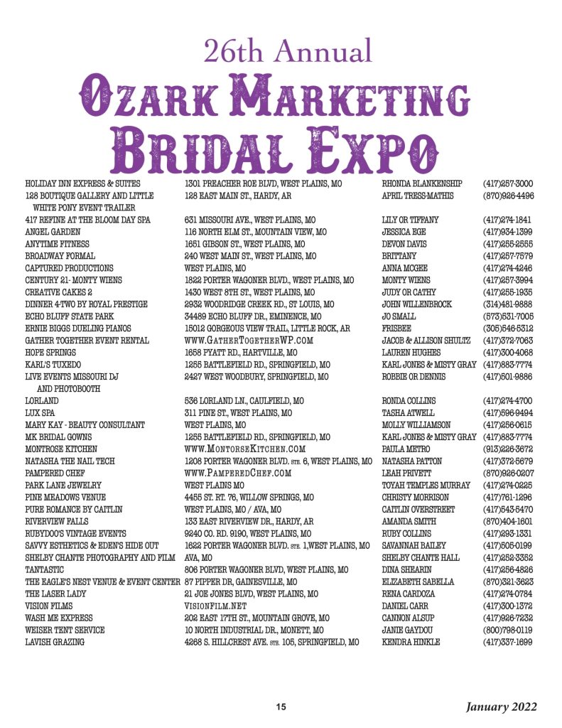 (West Plains, MO) With the 2022 Ozark Marketing Bridal Guide taking place at the West Plains Civic Center Saturday from 9AM-2PM the 2022 Bridal Guide has been released. The guide contains a list of vendors who will be at the event, that you will be able to meet with. It also features a spotlight on Libby Palmer our featured bride. You can download the guide by clicking here.