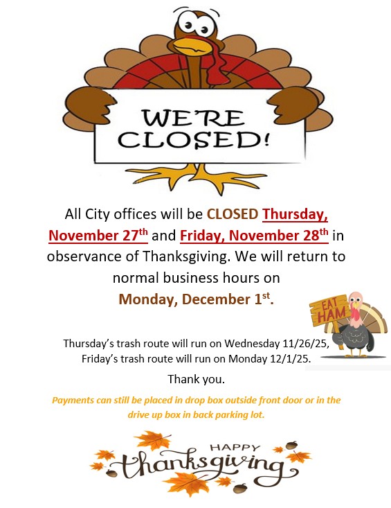 City offices will be closed on Thurs, Nov 27 and Fri, Nov 28 in observance of the Thanksgiving holiday. Trash routes will not be affected.