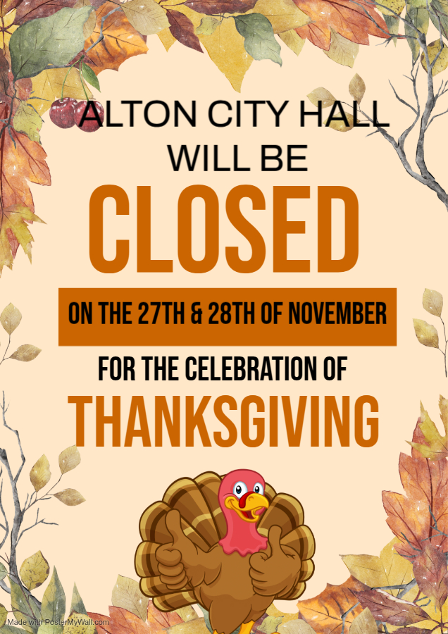 City Hall will be closed November 27 & 28 for the Thanksgiving Holiday.