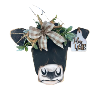 Created your own customized farmhouse cow head door hanger. Door hangers are made from unfinished MDF plywood and are ¼” think. They measure approximately 18”. See the website at Craft Workshops 2024-2025 | West Plains Council on the Arts for more details on the possibilities.