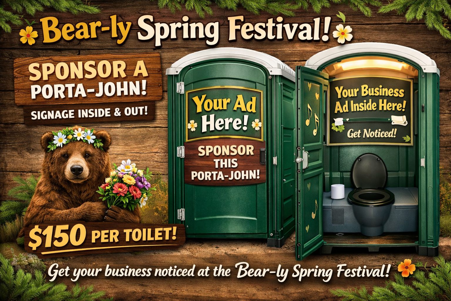 advertising displayed both inside and outside a sponsored portable restroom — a lighthearted and memorable way to promote your business while helping support this community event.