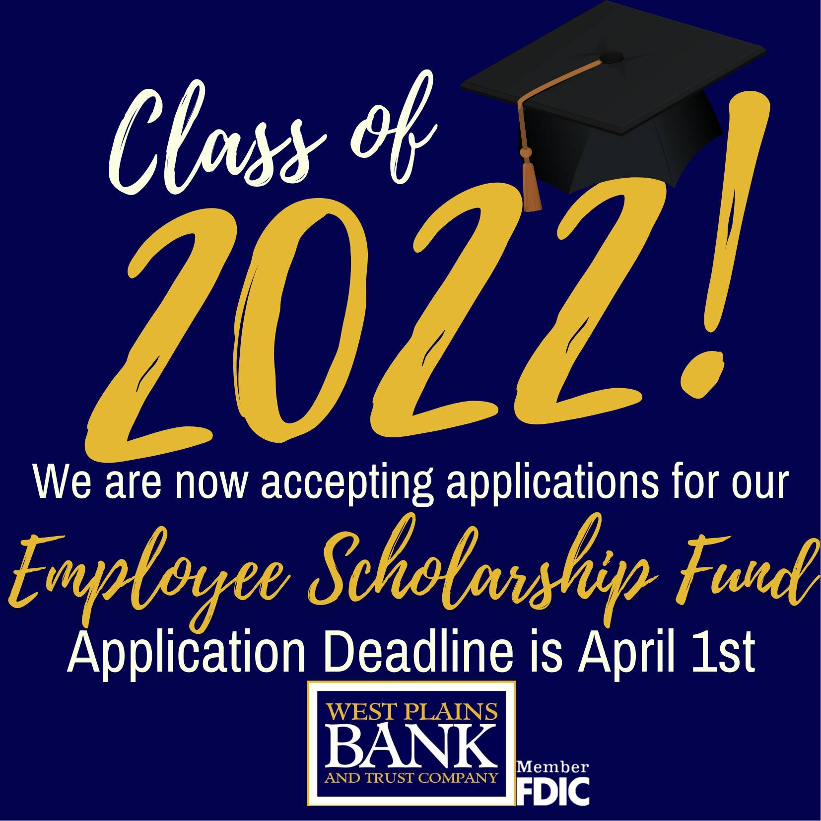WEST PLAINS, Mo. — West Plains Bank and Trust Company is offering one-time $2,000 scholarships to graduating seniors in the West Plains, Mountain View-Birch Tree, Willow Springs, and Houston school districts who are interested in pursuing careers in banking or a related field. To be eligible, applications must be postmarked no later than April 1, 2022.