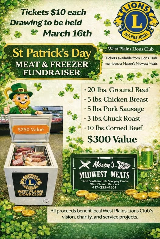 West Plains Lions Club is having a St. Patrick’s Day Meat and Freezer raffle fundraiser to help support our vision / eyeglass assistance, charity, and service projects. Mason’s Midwest Meats LLC is providing the assortment of quality meat. A mini-freezer is included. $550 value of meat and freezer.