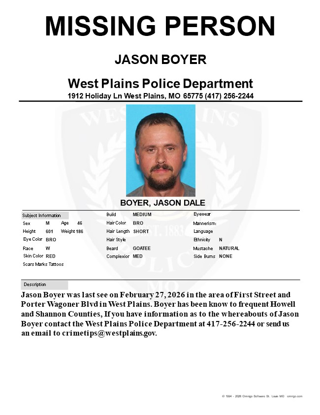 West Plains Police are asking for the public’s help locating 46‑year‑old Jason Dale Boyer. He was last seen February 27th near First Street and Porter Wagoner Boulevard in West Plains.