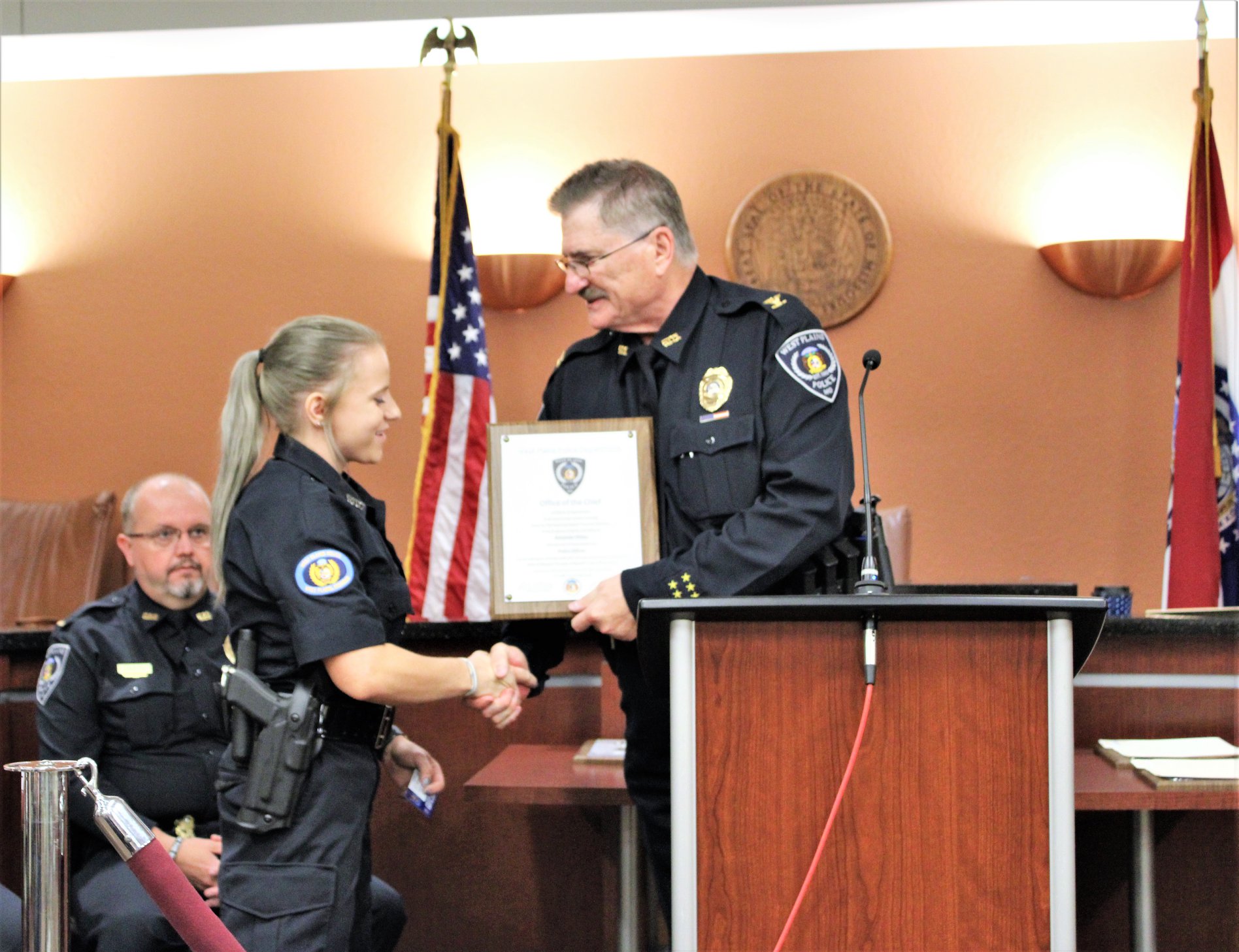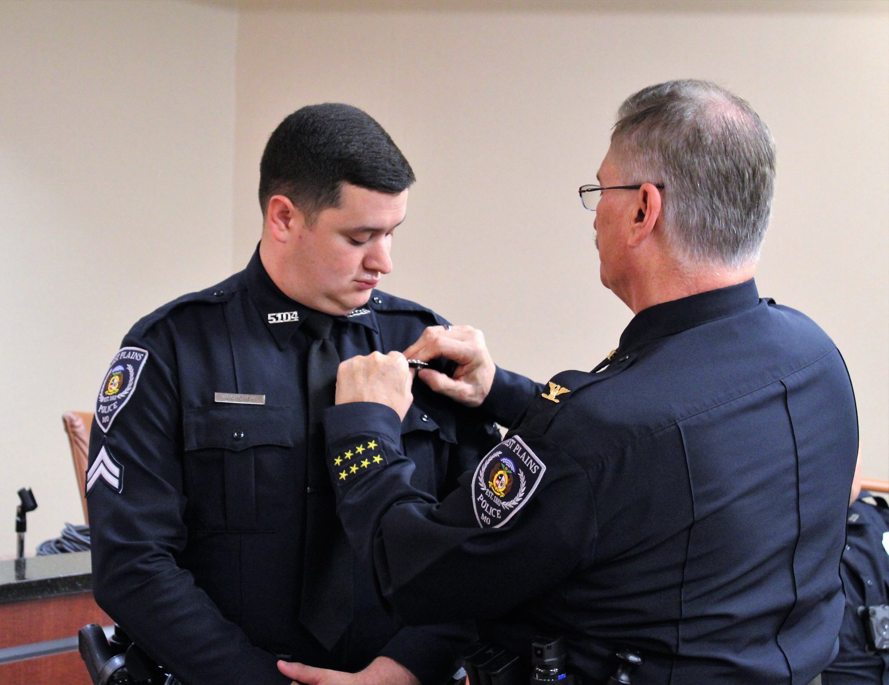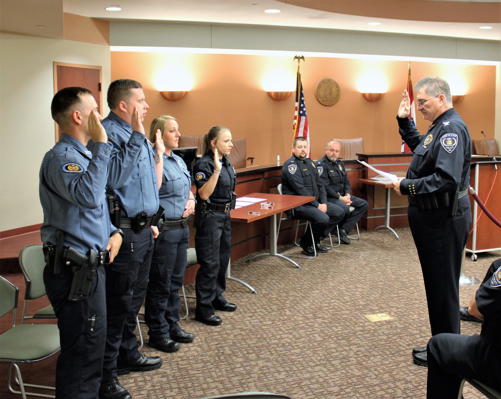 Tuesday (7/7), the West Plains Police Department held a pinning ceremony at West Plains City Hall to welcome four new officers to the department. Officers Colter Reid, Micah McKemie, Whitley Clark, and Amanda Ohlau began their law enforcement careers after graduating from the Police Academy Monday night (7/6).