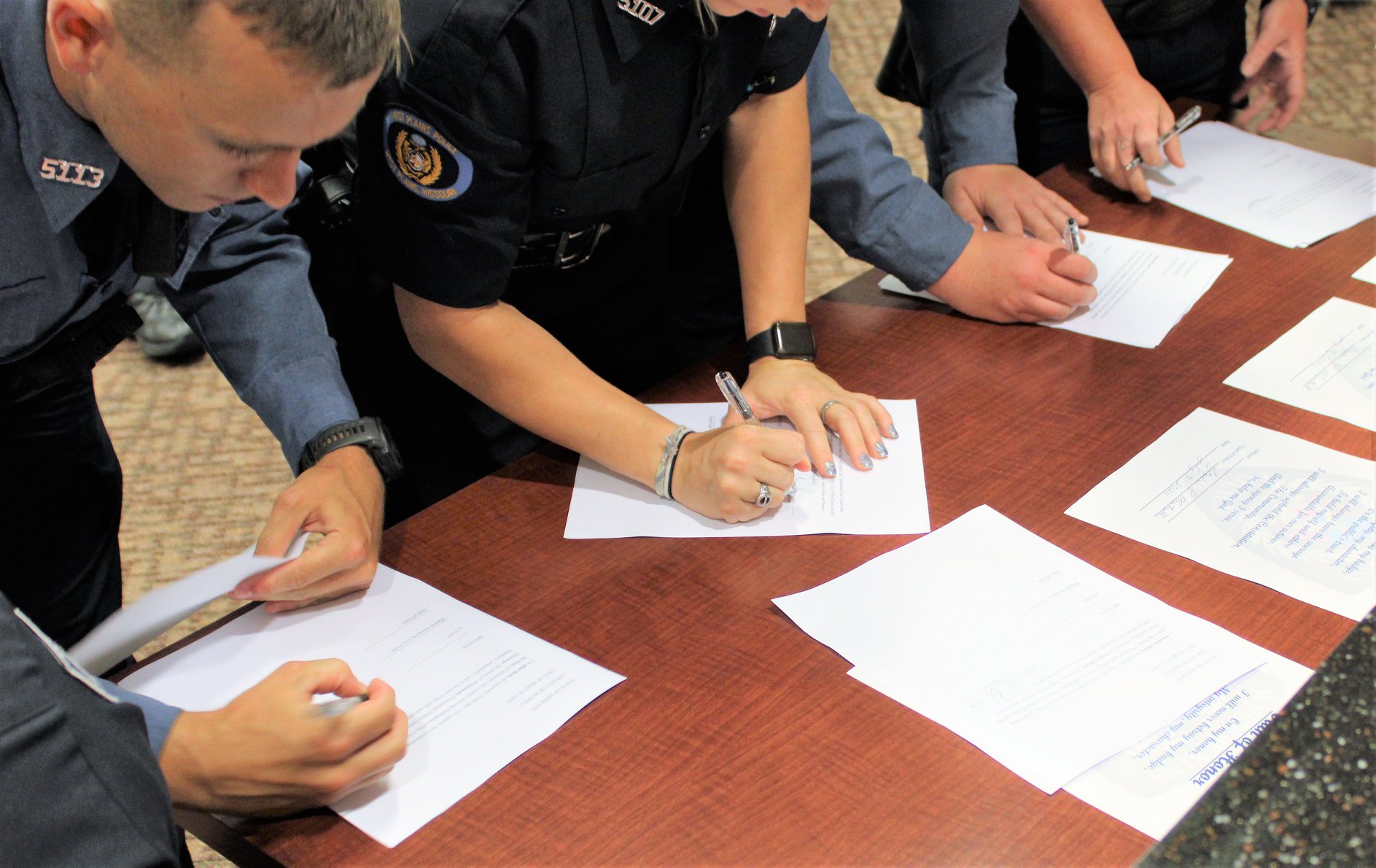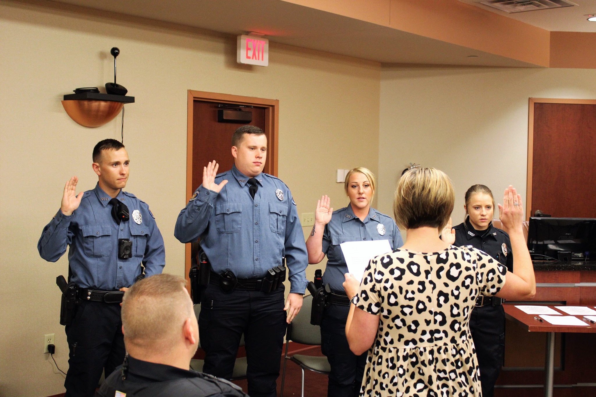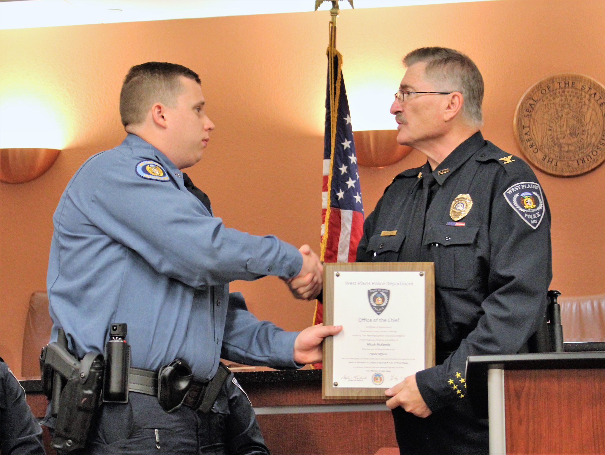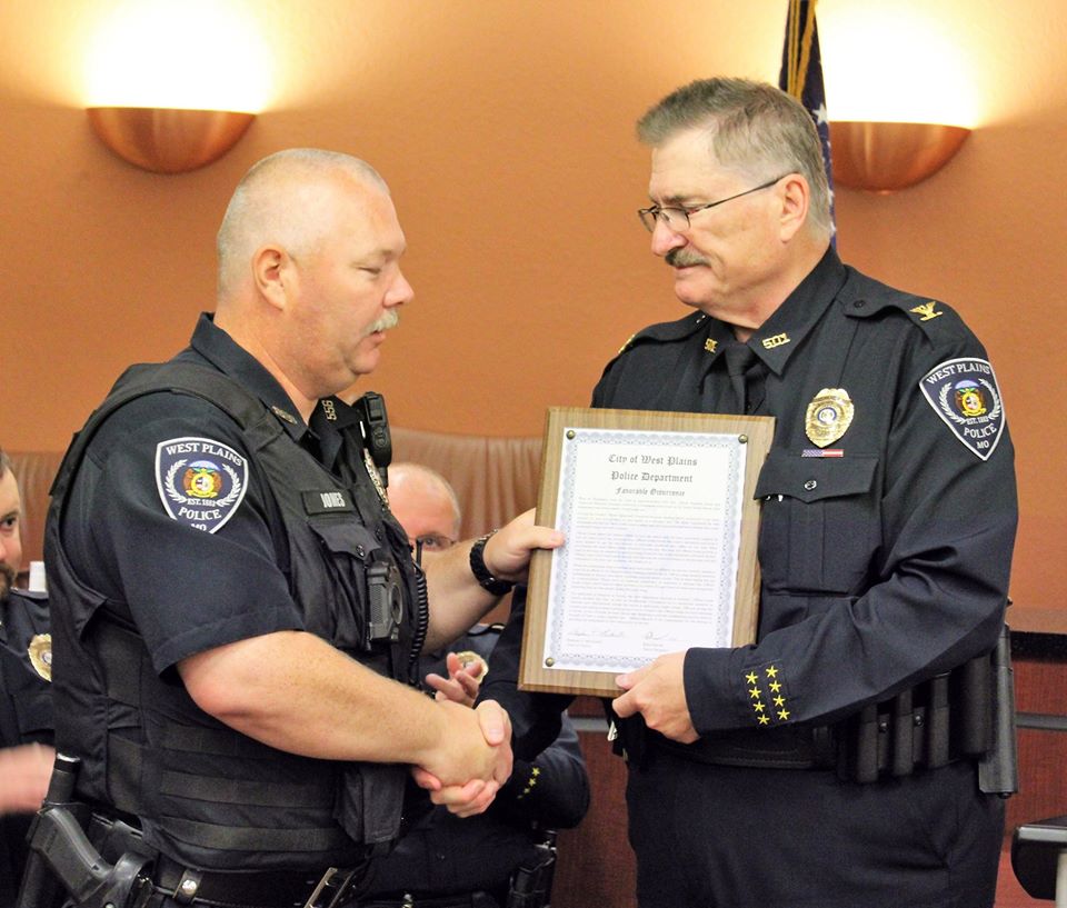 Tuesday (7/7), the West Plains Police Department held a pinning ceremony at West Plains City Hall to welcome four new officers to the department. Officers Colter Reid, Micah McKemie, Whitley Clark, and Amanda Ohlau began their law enforcement careers after graduating from the Police Academy Monday night (7/6).