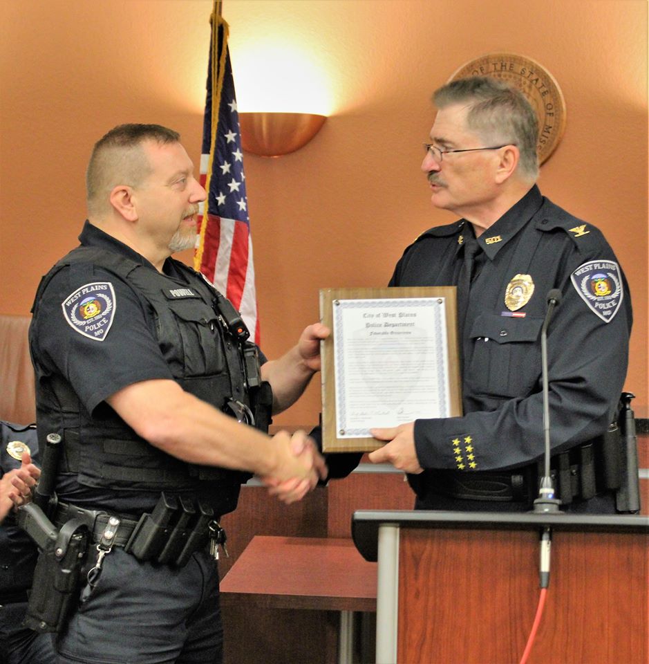 Officer Ivie Powell was given a Favorable Occurrence Award for his actions that resulted in the recovery of stolen vehicles, firearms and the arrest of the criminal who was in possession of them.