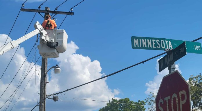 A Large truck has hooked a power pole and brought it down around Minnesota and Main, near the campus of MSU West...