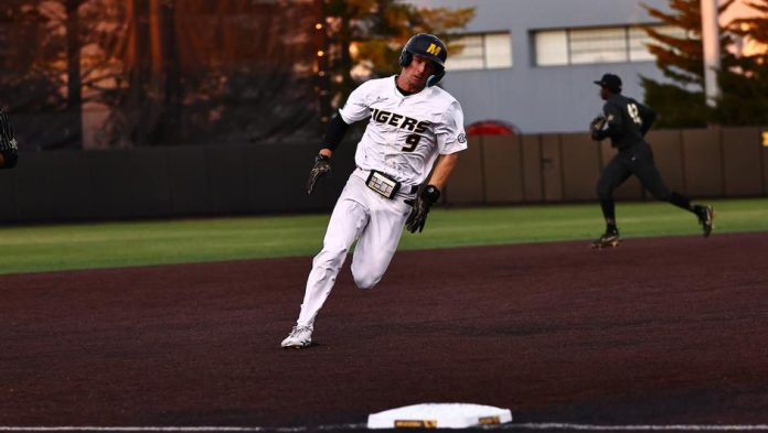 Mizzou’s Luke Mann paced the Tiger attack early, launching his ninth home run of the season to open the home half of the first, then driving in the second MU run with a one-out double to left-center in the fifth to pull the Tigers to within a single run.