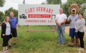 CARY STEWART CONSTRUCTION in West Plains will sponsor the prize money for flight winners at the 27th annual Grizzly Golf Classic Oct. 10 at the West Plains Country Club. Prizes for the winning teams in each flight are $600 per team for first place, $300 per team for second and $150 per team for third. Funds raised through the event will go toward the Bo Pace Memorial Scholarship and Grizzly Athletics at Missouri State University-West Plains (MSU-WP). To be a sponsor or register a team, visit WP.MissouriState.edu/GrizzlyGolf. From left are MSU-WP Event Coordinator Quin Patterson; Athletic Director Rusty Laverentz; Cary Stewart; Grizz; and Rachel Peterson, director of development and annual giving at MSU-WP. (MSU-WP Photo)