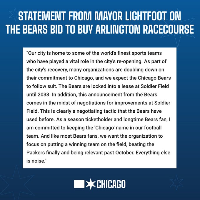 The Mayor said, “The Bears are locked into a lease at Soldier Field until 2033. This is clearly a negotiating tactic that the Bears have used before. As a season ticketholder and longtime Bears fan, I am committed to keeping the ‘Chicago’ name in our football team. Like most Bears fans, we want the organization to focus on putting a winning football team on the field, beating the Packers finally and being relevant past October. Everything else is noise.”