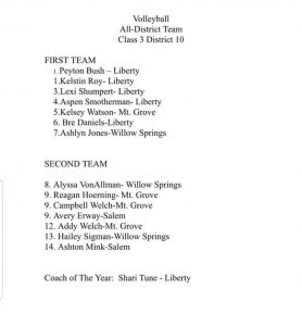 Sports Class 3 Dist 10 volleyball honors By Gary Lee - November 2, 2020 FacebookTwitterPinterestWhatsApp Congratulations to these girls for making the All-District Volleyball team and to Coach Tune for Coach of the Year! Also congratulations to the team for making it to sectionals and representing Liberty High School! Advertisement ShareTweet Advertisement