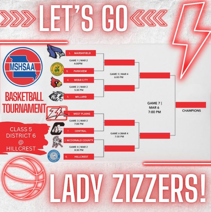 Class 5 District 6 Girls basketball seedings and match ups first round starts on Monday March 2nd. Marshfield #1 vs #8 Parkview at 4pm, #4 Webb City vs #5 Willard at 530, #2 West Plains vs #7 Central at 7pm and #3 McDonald County vs #6 Hillcrest at 830pm. All district 6 class 5 girls’ games will be played at Hillcrest.