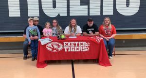 EXETER SOFTBALL standout Aubrey Antle recently signed a letter of intent to play for the Missouri State University-West Plains (MSU-WP) Grizzly Softball team beginning this fall. From left above are Antle’s brother Weston Ray, stepfather James Ray, sister Ellee Ray, mother Christina Ray, Antle, Antle’s father Shannon and stepmother Sarah. (MSU-WP Photos)