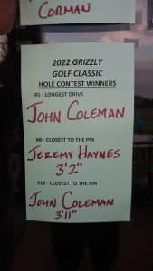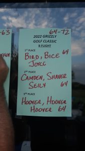 38 Teams competed in the 2022 Grizzly Golf Classic this past Monday afternoon at the West Plains Country Club. Winning the Championship flight with a 50, 20 under Sheridan, Lambel and Haynes. Winning A flight with a 61, 9 under Hutchings, Guffey and Williams. Winning B flight with a 64, 6 under Bird, Bice and Joyce. Longest drive was won by John Coleman. MSU-WP Booster club thanks all the golfers and sponsors of this fund rising event.