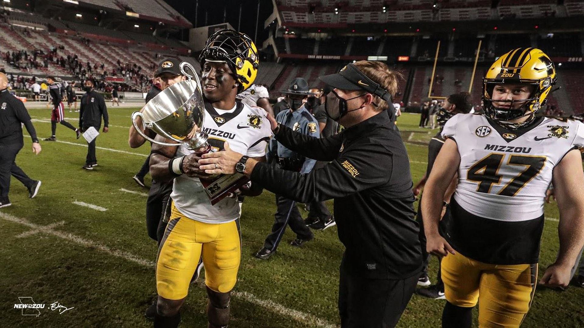 COLUMBIA, S.C. – Mizzou Football (3-3, 3-3 SEC) defeated South Carolina (2-6, 2-6 SEC), 17-10, Saturday night (Nov. 21) to claim the Mayor’s Cup Trophy for the second consecutive season. Despite being down to a limited roster numbers due to COVID issues and injuries, Mizzou opened a 17-0 lead by the intermission and never looked back to even its record and earn first-year head coach Eliah Drinkwitz his third win at Mizzou.