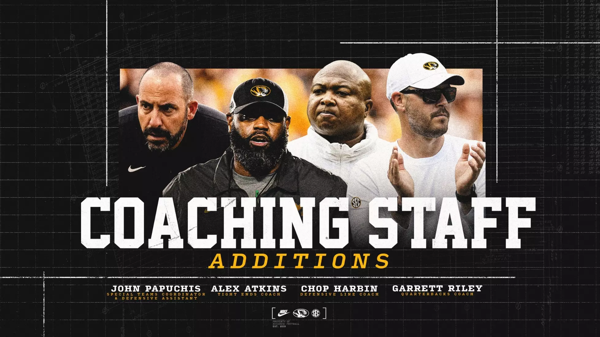 COLUMBIA, Mo. – Mizzou head football coach Eli Drinkwitz announced the hiring of four new assistant coaches for the 2026 season on Wednesday with John Papuchis, Alex Atkins, Lavorn “Chop” Harbin and Garrett Riley joining the Tigers staff.