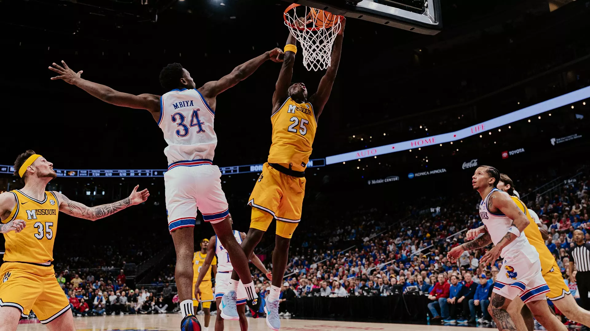 Missouri and Kansas traded buckets as the half continued with three lead changes through the first 12 minutes of the contest. A Mitchell fastbreak gave the Tigers a two-point advantage, 23-21, leading to a Jayhawk timeout with 4:28 to play in the first stanza.