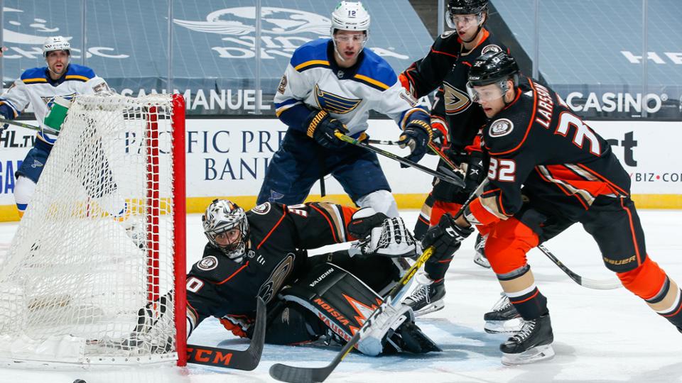 Jordan Kyrou scored 20 seconds in, Zach Sanford followed it up with a goal at the 57-second mark and then Kyrou scored again at 2:06, giving the Blues a new franchise record for the fastest to three goals to begin a game (126 seconds). It was the fastest to the mark in 34 years and fifth fastest all-time in NHL history. David Perron, Kyle Clifford and Vince Dunn also scored in a 6-1 rout at Honda Center.