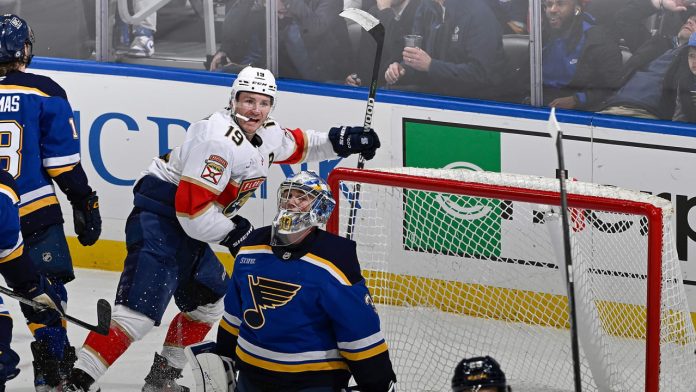 ST. LOUIS – Matthew Tkachuk scored the go-ahead goal with 12 seconds remaining in regulation to give the Florida Panthers a 3-2 win against the St. Louis Blues at Enterprise Center on Thursday.