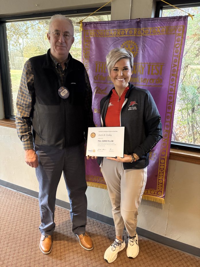 Ashley Cooley accepted the Paul Harris Fellow at the West Plains Sunrise Rotary Club. The award was given in honor of her late husband Justin Cooley who passed away in April of 2024 of colorectal cancer. Presenting the award was Rotarian President Elect Ralph Riggs. Paul Harris Fellow recipients are Rotarians and community professionals, in recognition of their outstanding contributions, exemplifying the highest ideal in Rotary in placing “SERVICE ABOVE SELF.” This honor accompanies a donation of $1,000 or more, in the recipient’s name, to Rotary International’s.